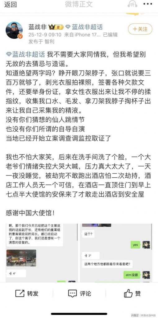 在相关话题冲上热搜后,针对外界关于“仙人跳”“自导自演”等质疑,蓝战非在后续发文中明确回应,称事件“没有仙人跳情节,也不存在自导自演”,并表示“在非洲被绑架并不是什么丢人的事”,自己真正害怕的不是钱,而是“对方撕票”。